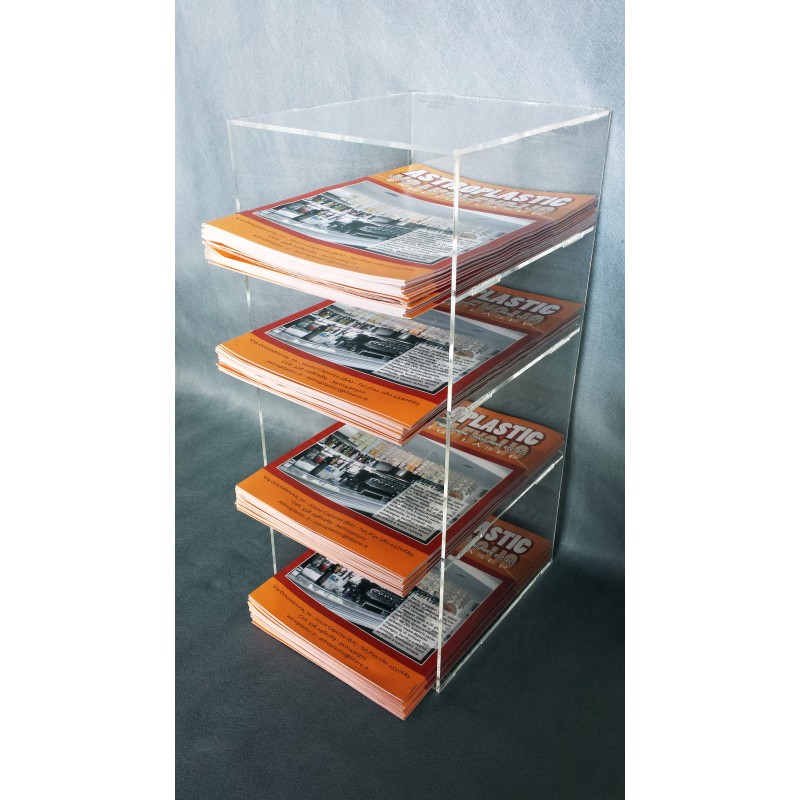 Espositore da banco in plex porta depliant fogli A4 - 4 pianiMisure: H 52 x L 23 x P 25
